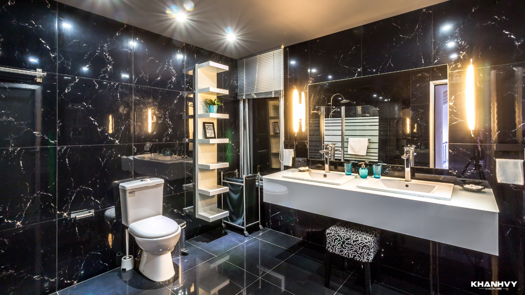 Nếu muốn tăng sự sang trọng, đá hoa cương (granite) hoặc đá cẩm thạch (marble) là lựa chọn phổ biến nhờ độ bền cao, vân đá tự nhiên độc đáo, đồng thời chịu nước và chống trầy xước tốt. Đây là vật liệu thường được dùng cho mặt bàn lavabo, khu vực sàn hoặc ốp tường tạo điểm nhấn.