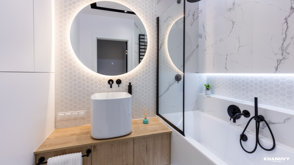 Trong thiết kế nhà tắm hiện đại, ánh sáng không chỉ là yếu tố chiếu sáng cơ bản mà còn góp phần định hình phong cách và tạo cảm xúc cho không gian. Một phòng tắm được bố trí ánh sáng hợp lý sẽ mang lại sự thoải mái, thư giãn và làm nổi bật vẻ đẹp của từng chi tiết nội thất.