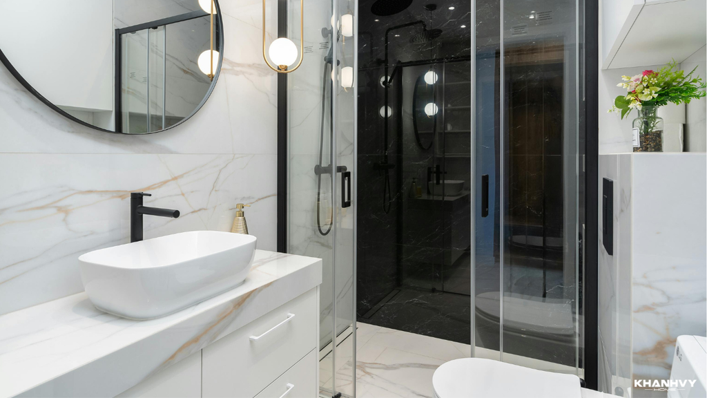 Không gian hiện đại, tối giản với vách kính trong suốt phân chia khu vực khô – ướt