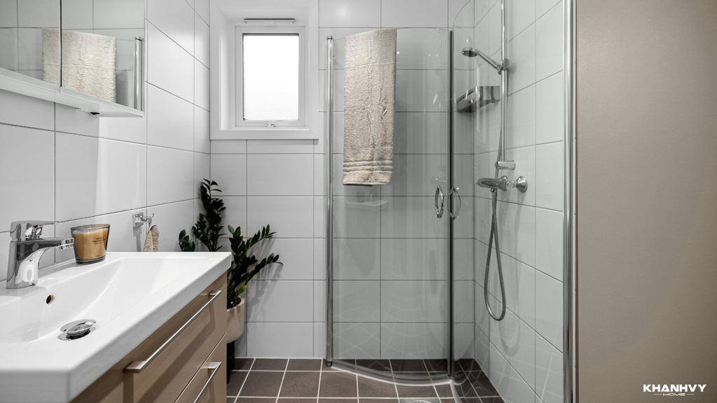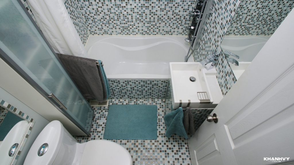 Bên cạnh đó, việc sử dụng gam màu sáng và gương lớn giúp không gian nhỏ trở nên rộng mở hơn. Vách kính tắm đứng trong suốt cũng là lựa chọn thông minh, vừa phân chia khu khô – ướt, vừa giữ cho phòng tắm sạch sẽ.