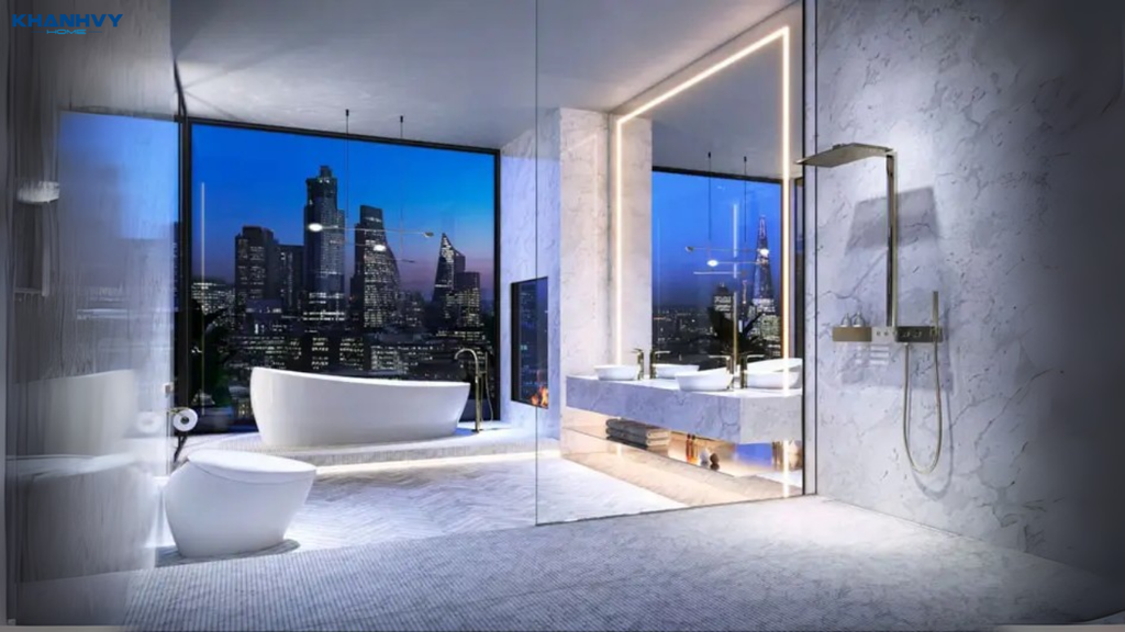 Phòng tắm hiện đại view thành phố với bồn tắm nằm sang trọng và thiết kế kính mở rộng không gian