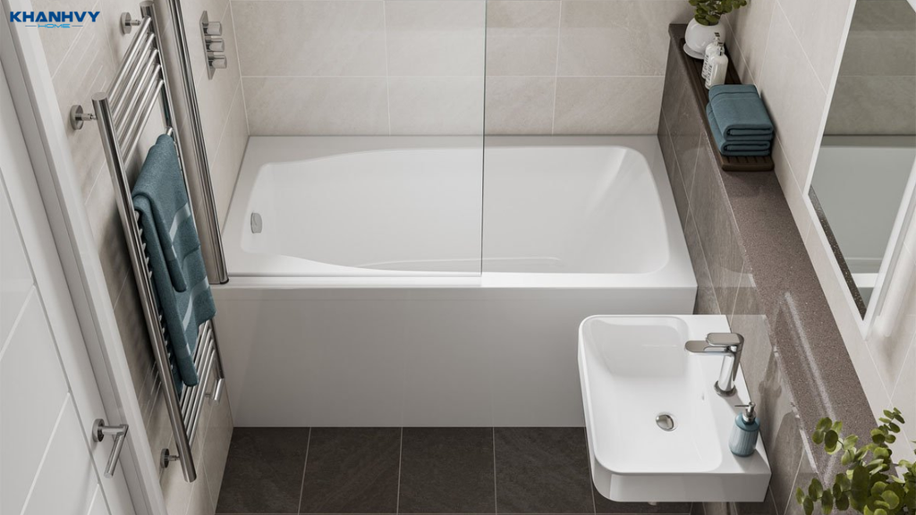 Để lắp đặt bồn tắm cơ bản, phòng tắm cần có diện tích từ 3 – 5m². Với diện tích này, gia chủ có thể lựa chọn các mẫu bồn tắm nhỏ hoặc bồn tắm góc nhằm tiết kiệm không gian. Tuy nhiên, việc bố trí cần thật khoa học, sắp xếp hợp lý để vẫn có chỗ cho lavabo và bồn cầu. Loại phòng tắm này thường phù hợp với căn hộ chung cư nhỏ hoặc nhà phố có diện tích hạn chế.