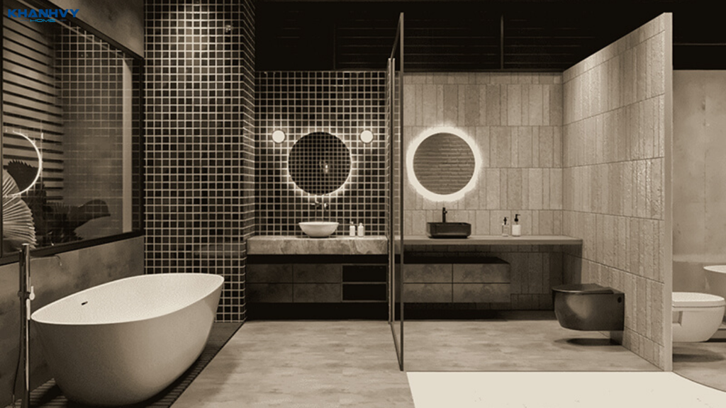 Phòng tắm là nơi thường xuyên tiếp xúc với nước nên độ ẩm cao. Do đó, cần có cửa sổ, quạt thông gió hoặc hệ thống hút ẩm để đảm bảo không khí lưu thông, tránh nấm mốc và mùi khó chịu. Về sàn, nên ưu tiên gạch có bề mặt nhám hoặc chống trơn để giảm nguy cơ té ngã. Ngoài ra, có thể đặt thêm thảm chống trượt ở gần bồn tắm và khu vực lavabo để tăng độ an toàn, đặc biệt đối với gia đình có trẻ nhỏ và người lớn tuổi.