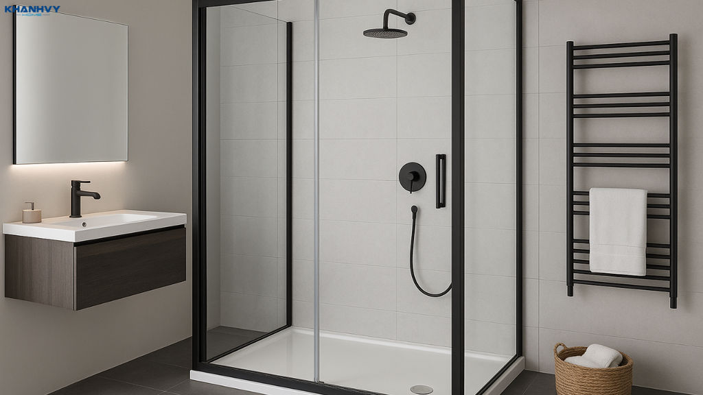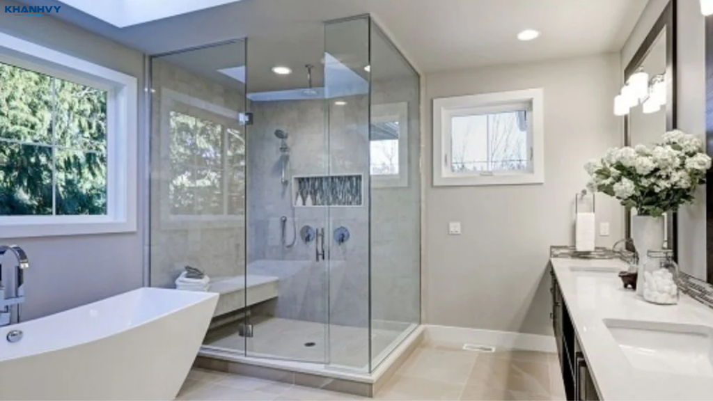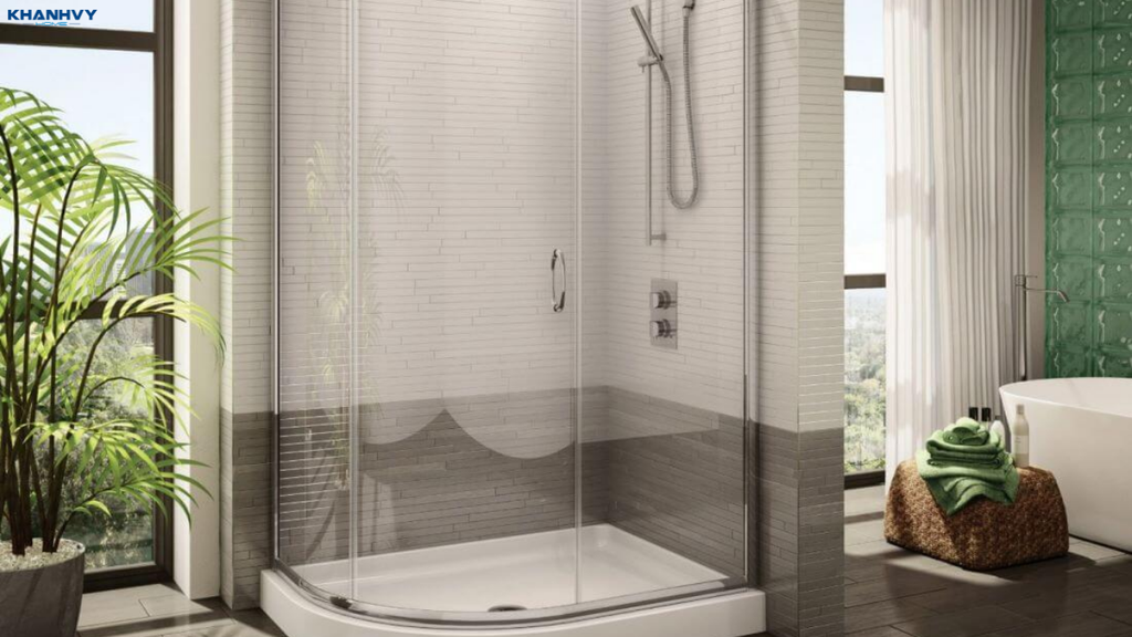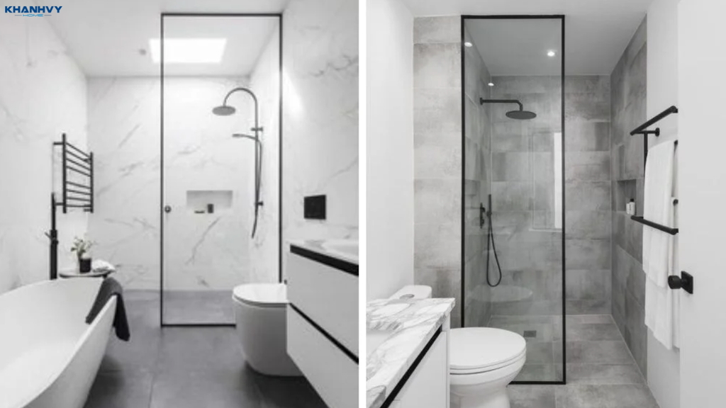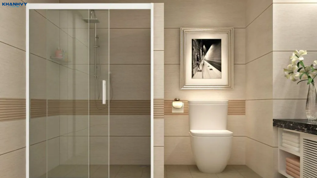 Vách kính: Kính cường lực dày 8–12 mm, có thể trong suốt hoặc mờ, chống bám nước và dễ vệ sinh.