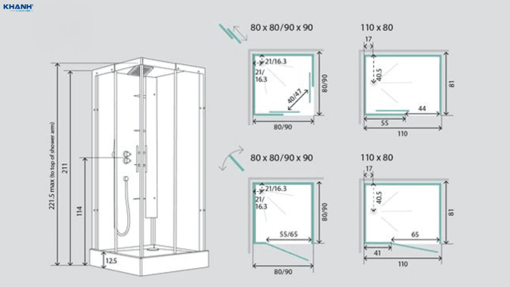 Cửa: Có thể mở quay hoặc cửa lùa, linh hoạt theo không gian phòng tắm và nhu cầu sử dụng.