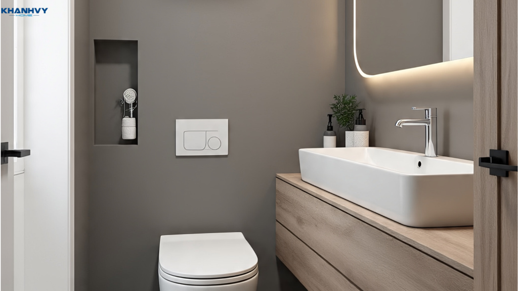 Với diện tích hạn chế, việc chọn thiết bị vệ sinh có kích thước nhỏ gọn, thiết kế hiện đại và đa chức năng là rất cần thiết. Các thiết bị như bồn cầu treo tường, lavabo âm tường hoặc chậu lavabo có thiết kế mỏng nhẹ giúp tiết kiệm diện tích sàn. Ngoài ra, các sản phẩm tích hợp nhiều tính năng thông minh như vòi sen điều chỉnh nhiệt độ, bồn cầu tự động sẽ nâng cao tiện ích mà không chiếm nhiều không gian.