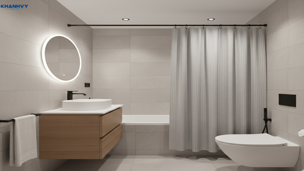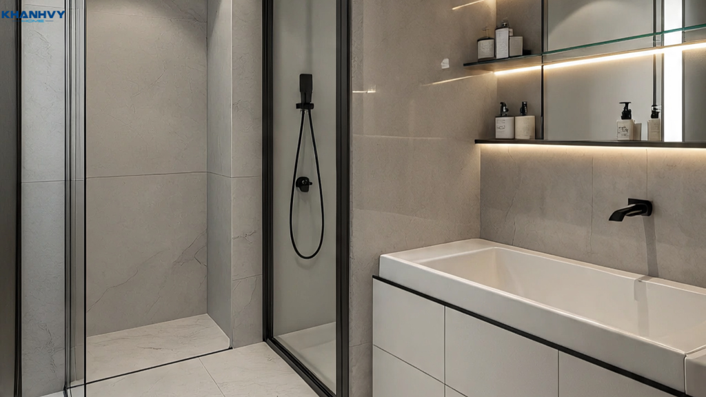 Có thể dùng vách kính cường lực hoặc rèm chống nước để ngăn cách khu vực tắm với phần còn lại phòng, nhằm hạn chế nước bắn ra ngoài và giữ cho khu vực khô ráo sạch sẽ.