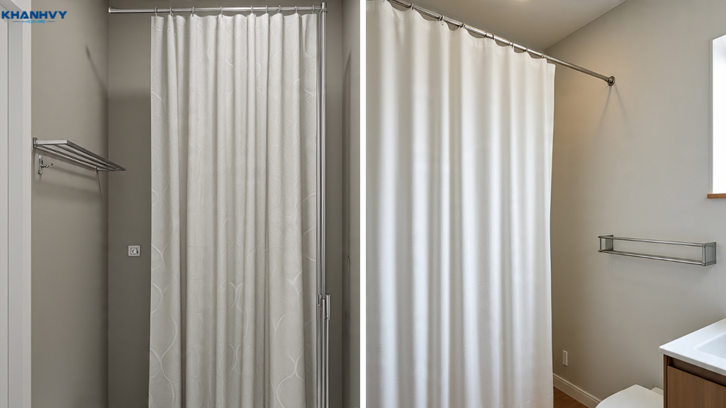 Bố trí khu vực tắm và các thiết bị xung quanh tránh nước bắn lan rộng, đảm bảo không gian khô ráo. Rèm tắm có ưu điểm linh hoạt, dễ kéo gập gọn giúp tận dụng tối đa không gian khi không sử dụng.