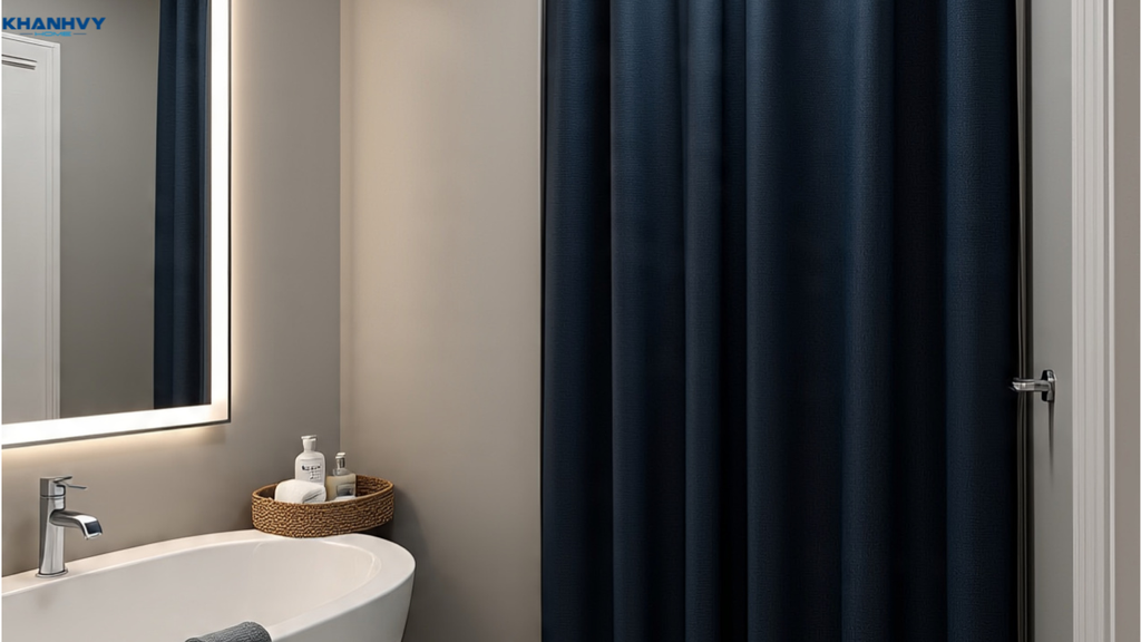 Một số gia chủ hoặc không gian hạn chế chi phí sẽ chọn mẫu phòng tắm không dùng vách kính mà sử dụng rèm ngăn nước. Rèm tắm thường làm từ nhựa PE hay vải chống thấm, dễ lắp đặt và thay thế. Lựa chọn rèm có họa tiết nhẹ nhàng, màu sắc sáng giúp tạo điểm nhấn và cảm giác rộng hơn.