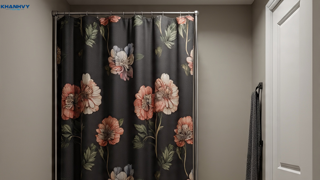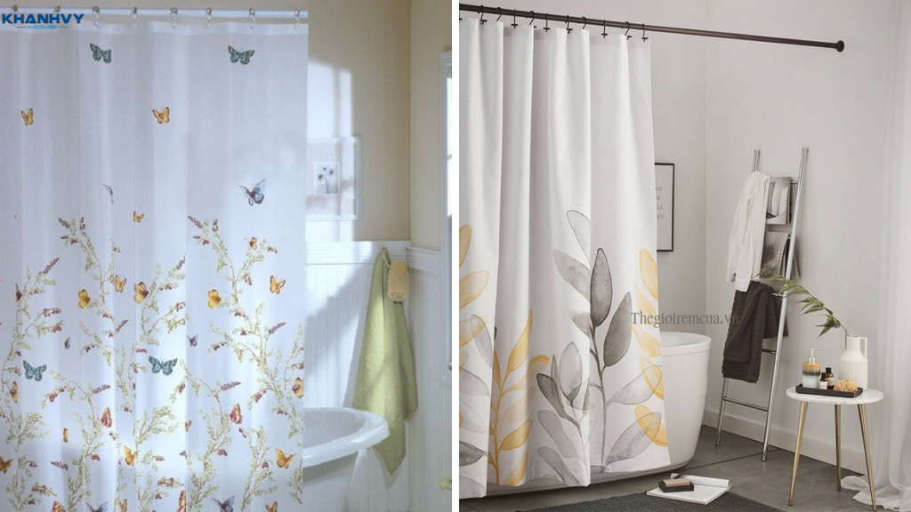 Mẫu phòng tắm sử dụng rèm họa tiết hoa văn nhẹ nhàng