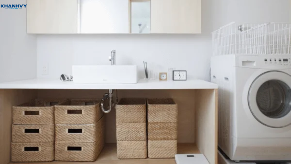 Kệ để đồ cá nhân, mỹ phẩm nên đặt bên dưới hoặc cạnh lavabo, có thể chọn các loại kệ âm tường hoặc kệ treo để tiết kiệm diện tích sàn.