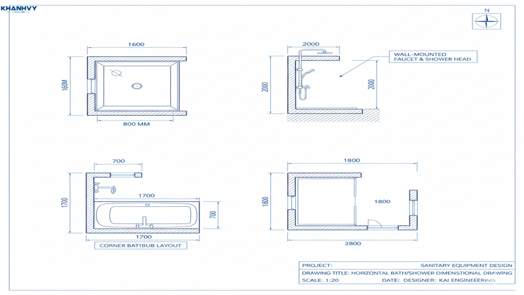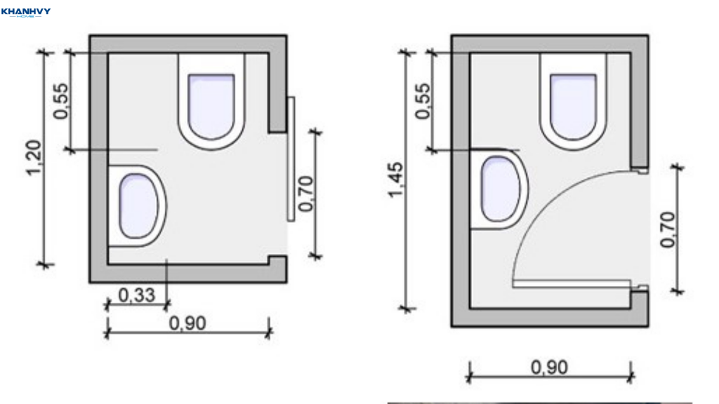 Phòng tắm có diện tích 3m2 khá nhỏ nên việc bố trí mặt bằng hợp lý là yếu tố quyết định giúp không gian vừa tiện nghi vừa thoáng đãng. Dưới đây là hai phương án bố trí theo từng vị trí cửa và hình dạng mặt bằng phổ biến nhất: