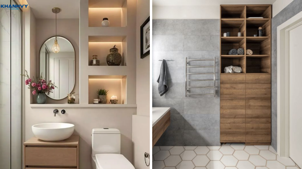 Kệ để đồ dùng cá nhân, mỹ phẩm, khăn tắm nên bố trí liền kề lavabo, có thể chọn loại kệ âm tường hoặc kệ treo nhằm tiết kiệm diện tích.