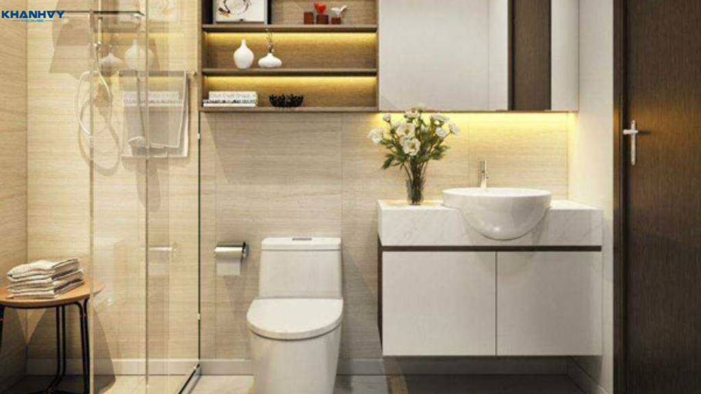 Trong diện tích nhỏ, việc tận dụng chiều cao tường để bố trí kệ, tủ âm tường hay giá treo là giải pháp lưu trữ hiệu quả, giúp giữ phòng tắm gọn gàng. Bạn có thể sử dụng tủ lavabo tích hợp, kệ kính hoặc giá lưới sát tường để đặt các vật dụng cá nhân, đồ vệ sinh mà không làm chiếm diện tích sàn.