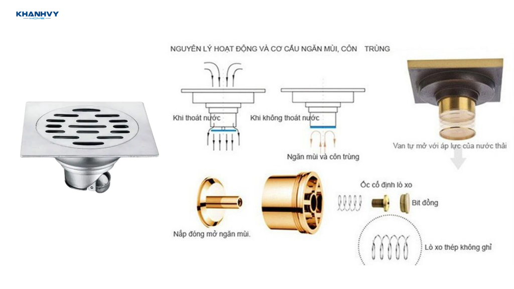 Bộ phận chống mùi: Có nhiều loại cơ chế chống mùi khác nhau như bẫy nước (giữ một lượng nước nhỏ để tạo lớp ngăn cách) hoặc van cơ học (hoạt động như van một chiều), giúp ngăn côn trùng và mùi hôi từ cống bốc lên.