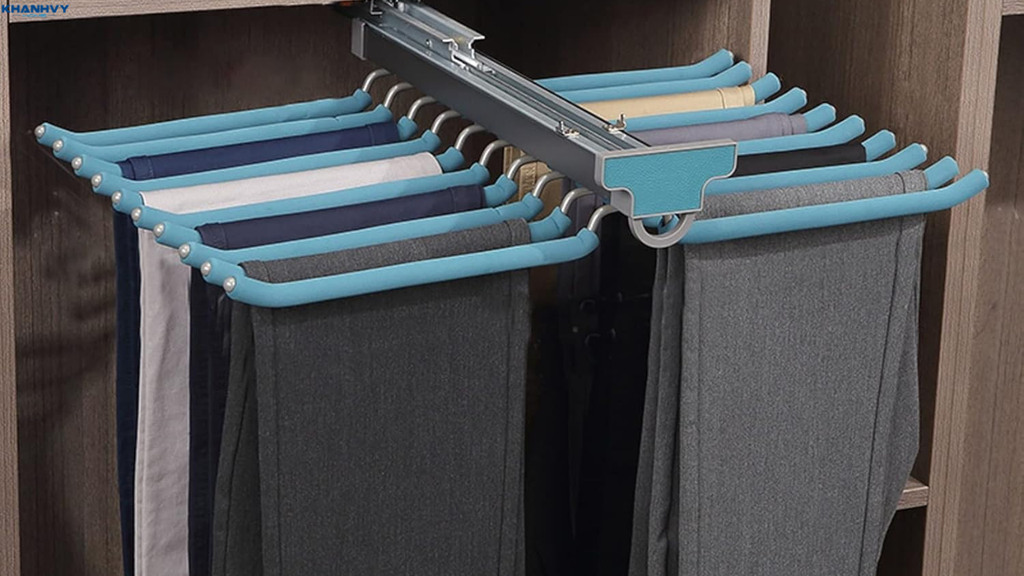 Giá treo quần âu được thiết kế đặc biệt để giữ quần luôn phẳng phiu, không bị nhăn hoặc trượt. Thường có dạng thanh ngang hoặc kẹp cố định, phụ kiện này giúp sắp xếp quần âu gọn gàng và dễ quan sát. Nhờ đó, người dùng có thể nhanh chóng lựa chọn trang phục khi cần, đồng thời giữ cho tủ đồ luôn ngăn nắp, thẩm mỹ.