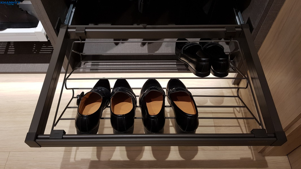 Kệ giày dép xoay hoặc trượt là phụ kiện hoàn hảo cho phần tầng dưới của tủ quần áo, giúp sắp xếp giày dép gọn gàng và dễ lấy. Kệ xoay tận dụng không gian theo chiều dọc, trong khi kệ trượt cho phép kéo ra nhẹ nhàng mà không làm xáo trộn các đôi giày khác. Thiết kế này giúp bảo quản giày dép tốt hơn, kéo dài tuổi thọ và giữ không gian tủ luôn sạch đẹp, tinh tế.