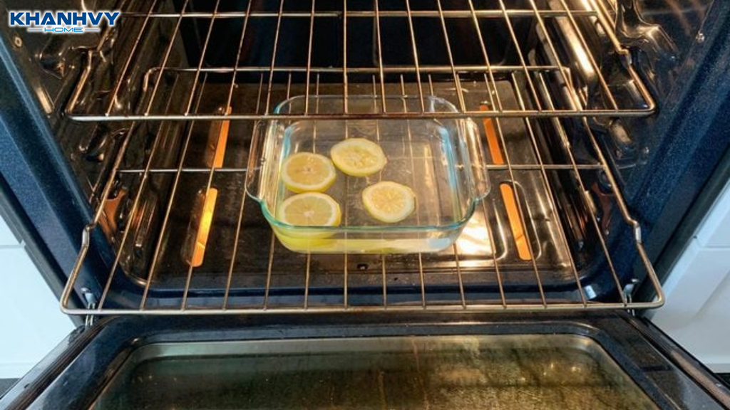 - Đặt tô nước chanh vào giữa lò nướng, đóng cửa lò và bật ở mức nhiệt khoảng 150–180°C trong 10–15 phút.