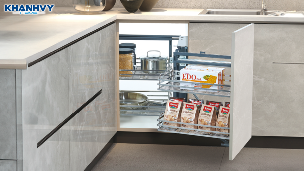 Kệ góc liên hoàn giải pháp tối ưu triệt để góc chết tủ bếp chữ L