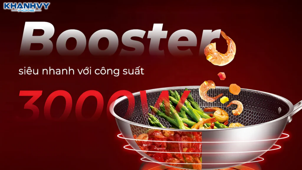 Ngoài ra, các dòng bếp từ hiện đại còn tích hợp Booster. Nhờ đó, người dùng chỉ sử dụng mức công suất cao khi cần thiết, tránh tình trạng tiêu thụ điện liên tục ở mức tối đa trong suốt quá trình nấu.