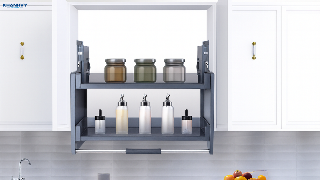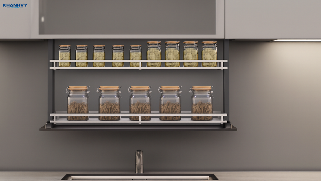 Kệ để gia vị nâng hạ là sản phẩm thuộc phân khúc cao cấp, mang đến sự tiện nghi vượt trội cho tủ bếp trên. Với cơ chế nâng – hạ đặc biệt, người dùng có thể kéo toàn bộ kệ xuống một cách nhẹ nhàng, lấy gia vị dễ dàng dù kệ được đặt ở vị trí cao.