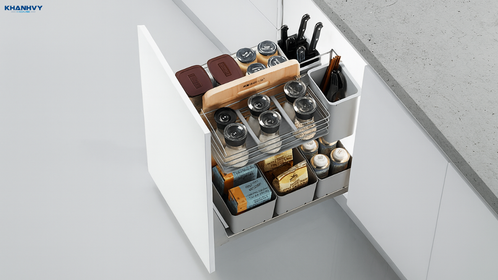 Một ưu điểm lớn của kệ gia vị cánh kéo là tính thẩm mỹ cao. Vì được giấu kín trong tủ, kệ giúp bếp luôn sạch sẽ, không bị rối mắt bởi quá nhiều lọ gia vị để bên ngoài. Bên cạnh đó, thiết kế ray trượt giảm chấn hiện đại giúp chuyển động mượt mà, không gây tiếng ồn và tăng tuổi thọ cho sản phẩm.