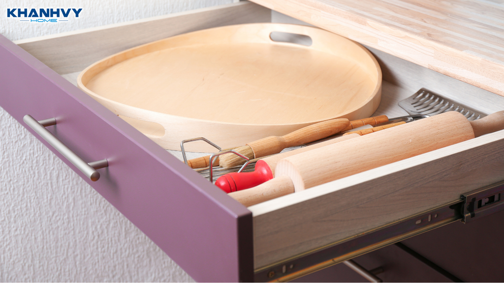 Với ngăn kéo, nên dùng khay chia dao, muôi, nĩa hoặc khay chia gia vị, vừa dễ lấy vừa giúp thao tác nhanh khi nấu nướng. Những phụ kiện này tuy nhỏ nhưng ảnh hưởng lớn đến sự gọn gàng và trải nghiệm sử dụng hằng ngày.