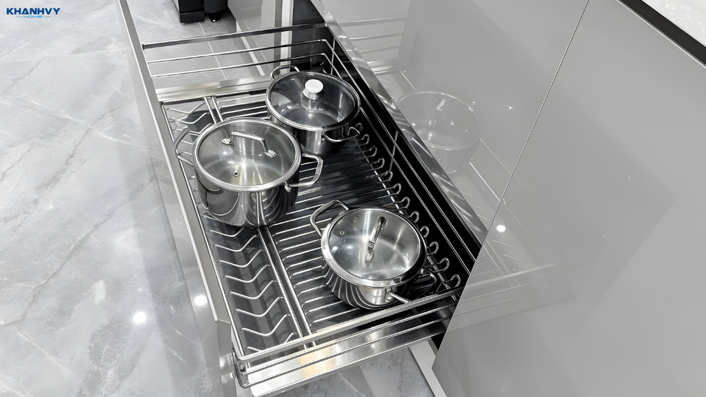 Kệ xoong nồi inox giúp tủ bếp dưới trở nên gọn gàng và thuận tiện hơn khi lấy – cất đồ nấu nướng.