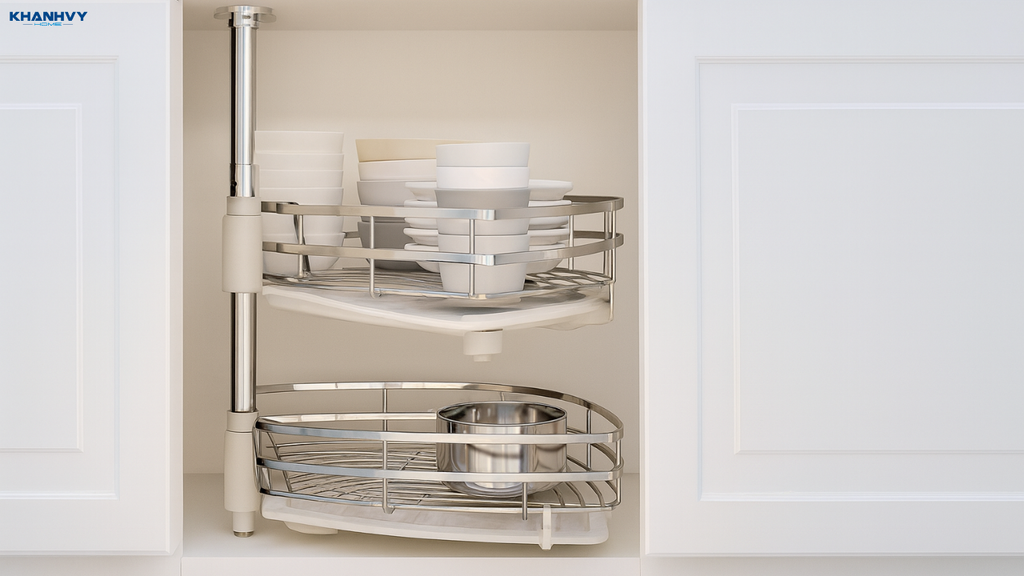 Mâm xoay inox giúp tận dụng tối đa không gian góc chết – khu vực thường bị bỏ phí trong tủ bếp chữ L hoặc chữ U.