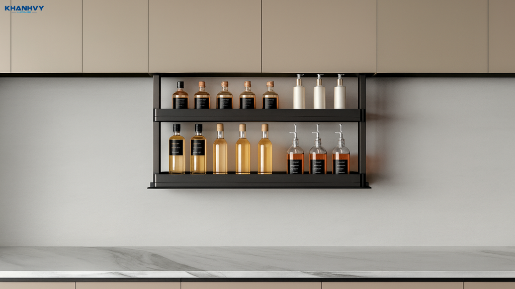 Nhiều mẫu kệ gia vị hiện nay tích hợp ray kéo giảm chấn, giúp bạn có thể kéo ra – đóng vào mượt mà. Một số còn được chia ngăn thông minh để lưu trữ dầu ăn, nước mắm, muối, tiêu… theo từng nhóm riêng biệt.
