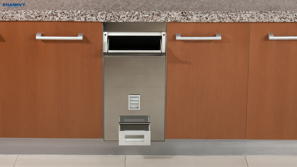 Thùng rác được đặt âm trong khoang tủ, khi kéo cánh tủ ra thì nắp tự động mở — giúp thao tác bỏ rác nhanh chóng và vệ sinh. Chất liệu inox bền, chống mùi, dễ rửa và không bị ăn mòn theo thời gian.