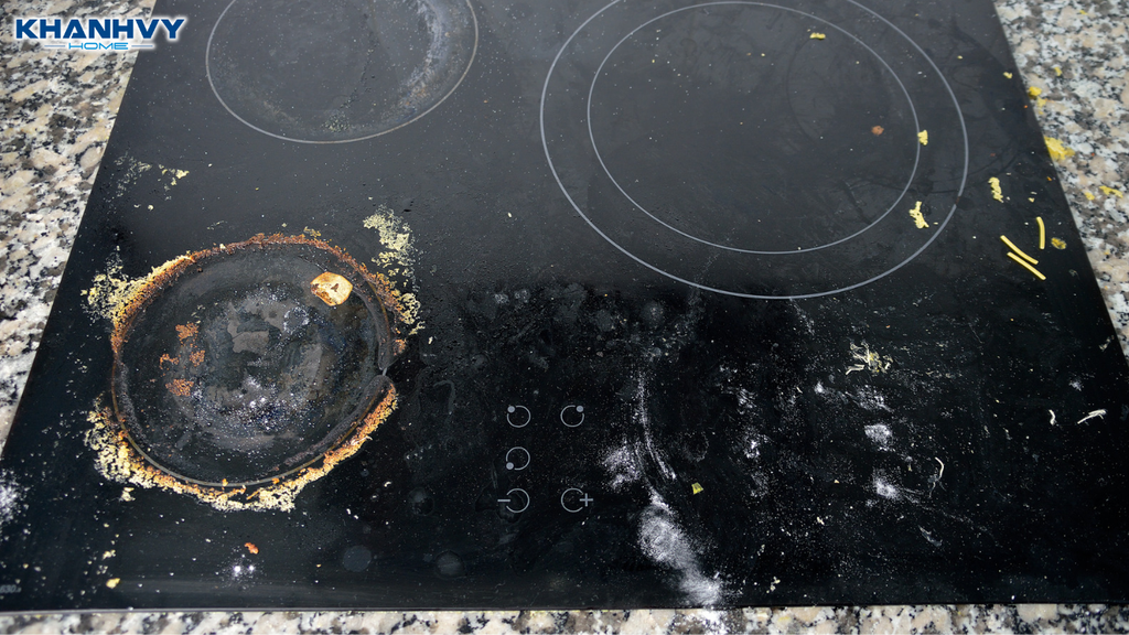 Bề mặt bếp bám dầu mỡ và cặn thức ăn cháy trên kính