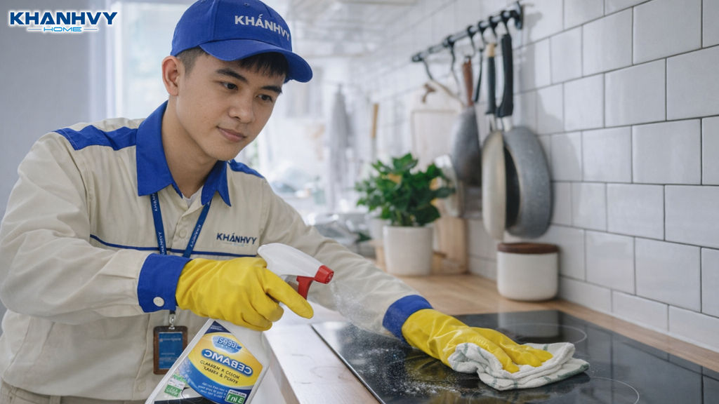 Đợi 1–2 phút rồi dùng khăn mềm lau lại. Tránh dùng miếng chà kim loại để không làm xước mặt kính.