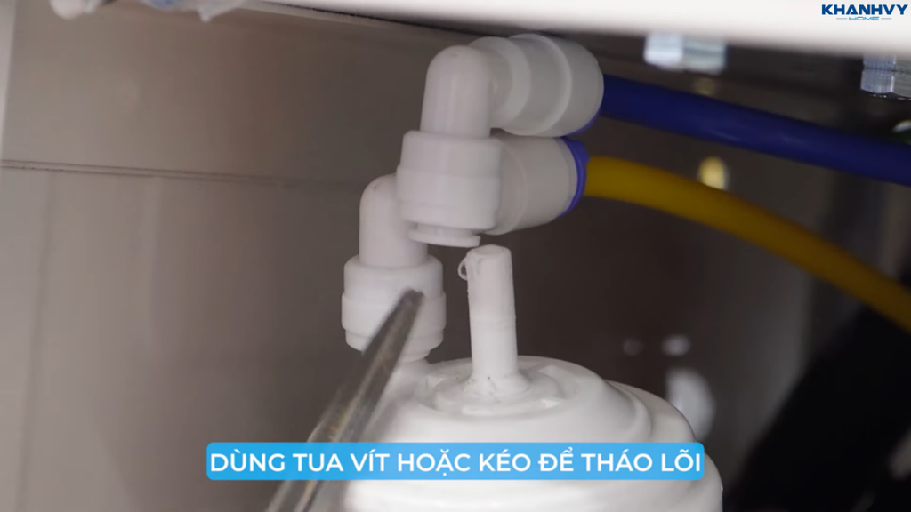 Xác định lõi cần thay. Nhấn và giữ chốt cút nối rồi rút ống nước ra. Tháo lõi cũ. Lấy lõi mới, bóc ni-lông và tháo nắp bịt đầu lõi.