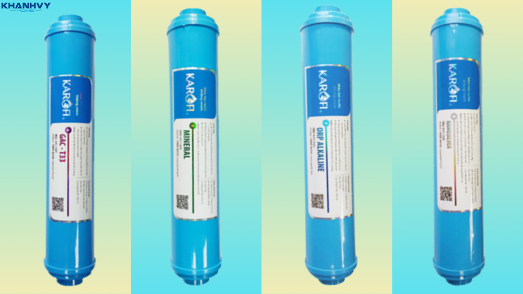 Các lõi lọc chức năng (GAC-T33, Khoáng đá, Alkaline, Nano Silver) của Karofi, dùng để bổ sung khoáng chất và cân bằng pH