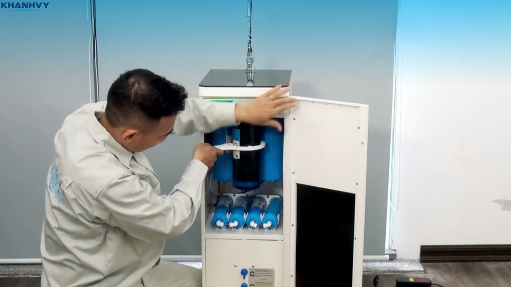 Mở lại van bình áp, van nước cấp và cắm điện. Quan sát kỹ lưỡng các cút nối vừa thao tác để kiểm tra rò rỉ. Xả nước qua các lõi chức năng mới khoảng 10 phút trước khi sử dụng.