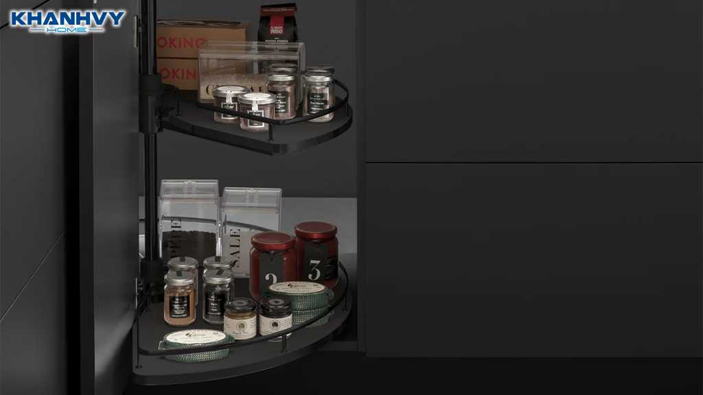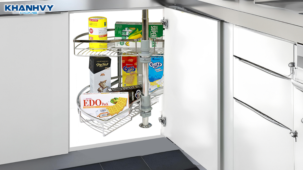 - Tận dụng góc tủ sâu: Nếu tủ bếp có những góc khó sử dụng, kệ xoay 360 độ sẽ giúp bạn tận dụng tối đa diện tích mà không bỏ sót bất kỳ món đồ nào.