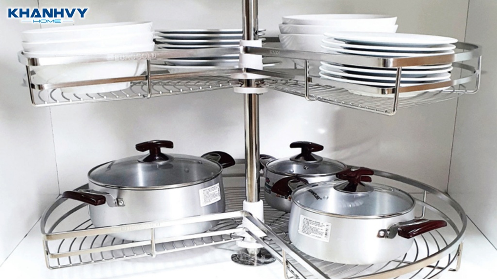 Sản phẩm được xem là giải pháp tối ưu hóa không gian hiệu quả, giúp khai thác triệt để diện tích bên trong tủ, đồng thời mang đến sự gọn gàng và tiện nghi trong quá trình nấu nướng. Với đa dạng kiểu dáng, chất liệu như inox 304, inox mạ crom hay nhựa ABS cao cấp, kệ góc xoay phù hợp với nhiều phong cách tủ bếp, từ hiện đại đến truyền thống.