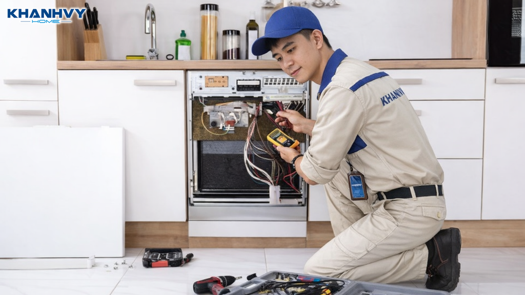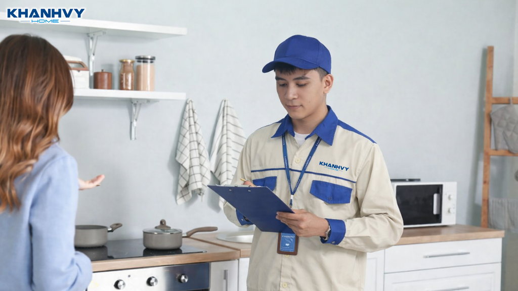 - Đội ngũ kỹ thuật viên giàu kinh nghiệm: Khánh Vy Home có đội ngũ kỹ thuật viên chuyên sửa chữa nhiều loại thiết bị gia dụng như bếp từ, máy hút mùi, lò vi sóng, máy rửa chén và máy lọc nước.