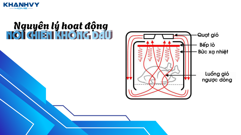 Trong khi đó, nồi chiên không dầu sử dụng cơ chế làm nóng bằng thanh nhiệt kết hợp quạt đối lưu. Luồng khí nóng được thổi mạnh và liên tục xung quanh thực phẩm, giúp bề mặt món ăn nhanh chóng đạt nhiệt độ cao.