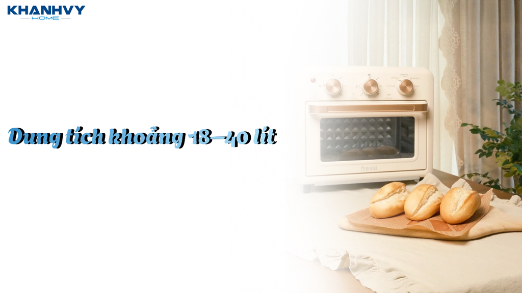 Lò nướng bánh mì gia đình thường có dung tích khoảng 18–40 lít, chiều ngang phổ biến 40–50 cm, phù hợp đặt cố định trên mặt bếp. Với kích thước này, người dùng có thể nướng 3-4 ổ bánh mì trong một lần, đồng thời đặt được khay nướng rộng cho bánh ngọt hoặc pizza nhỏ.