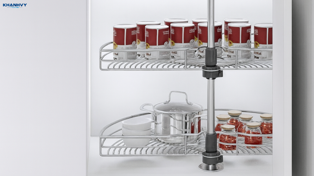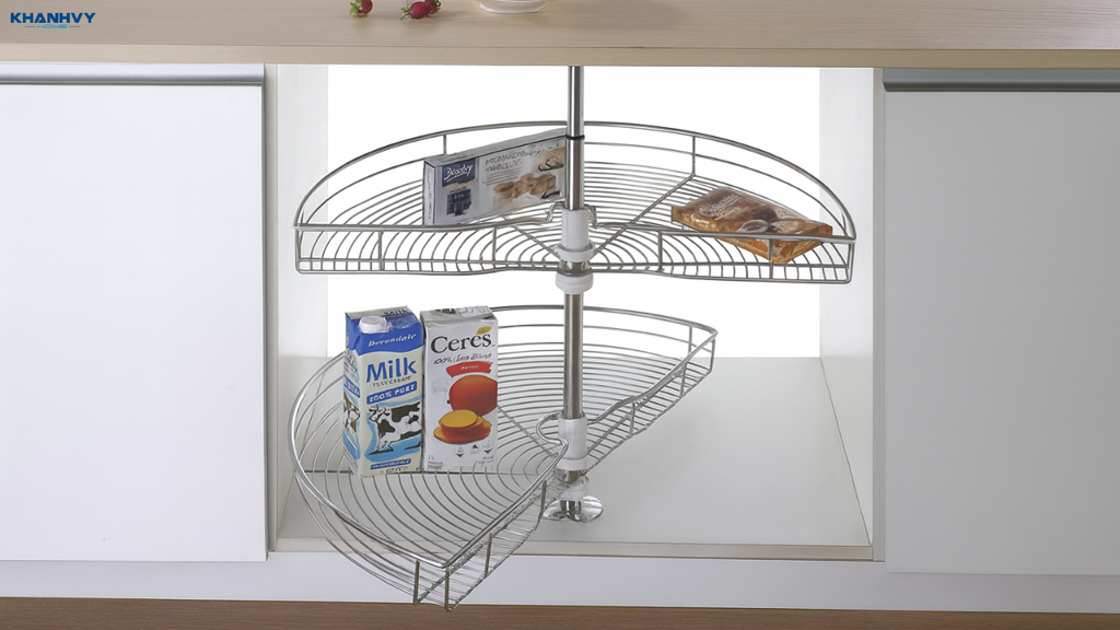 Mâm xoay này thường bao gồm hai khay xoay gắn theo trục giữa, cho phép bạn kéo toàn bộ khay ra ngoài khi mở cửa tủ và xoay 180° để lấy đồ. Nhờ thiết kế này, bạn không cần phải với tay sâu vào góc tủ, vừa thuận tiện vừa giảm nguy cơ va chạm hay rơi đồ.