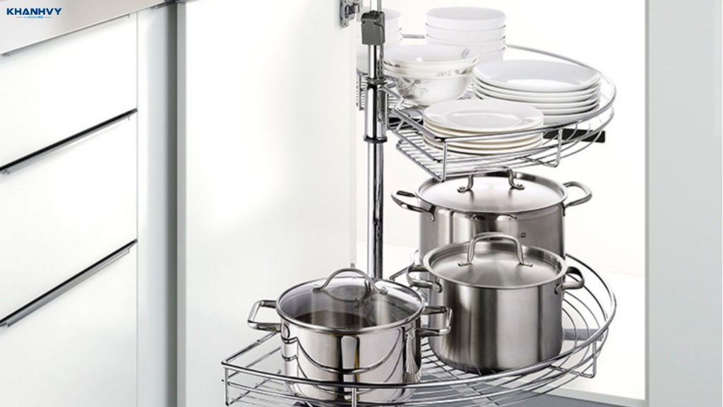 Mâm xoay độc lập vẫn đảm bảo thao tác lấy đồ dễ dàng và mượt mà, đồng thời chịu lực tốt, phù hợp với các vật dụng nặng như nồi, chảo hay các hộp thực phẩm lớn. Loại này cũng có thể được thiết kế nhiều tầng, giúp phân loại đồ dùng hiệu quả hơn và tận dụng tối đa không gian góc chết trong tủ.