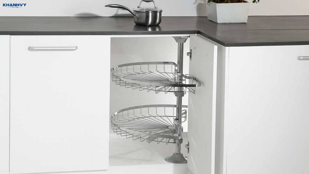 Loại mâm xoay này đặc biệt thích hợp với tủ bếp góc chữ L hoặc chữ U, nơi các góc chết thường khó tiếp cận. Với thiết kế gắn cánh, bạn không cần phải cúi sâu hay luồn tay vào bên trong tủ, mọi vật dụng từ xoong, nồi đến chai lọ đều dễ dàng lấy ra. Ngoài ra, mâm xoay gắn cánh còn giúp căn bếp trở nên gọn gàng và hiện đại, vì đồ đạc luôn được sắp xếp ngăn nắp theo từng khay xoay, đồng thời tối ưu không gian sử dụng.