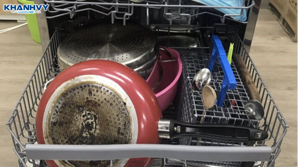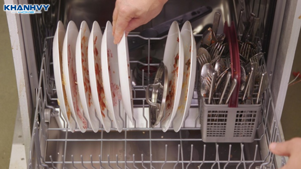 Cách xử lý: Cần phân loại bát, đĩa, ly cốc và nồi chảo đúng theo từng khay. Đặt mặt bẩn hướng vào trung tâm khoang rửa, không xếp vượt quá tải trọng cho phép. Trước khi khởi động máy, nên kiểm tra nhanh để đảm bảo tay phun có thể xoay tự do, không bị cản trở.