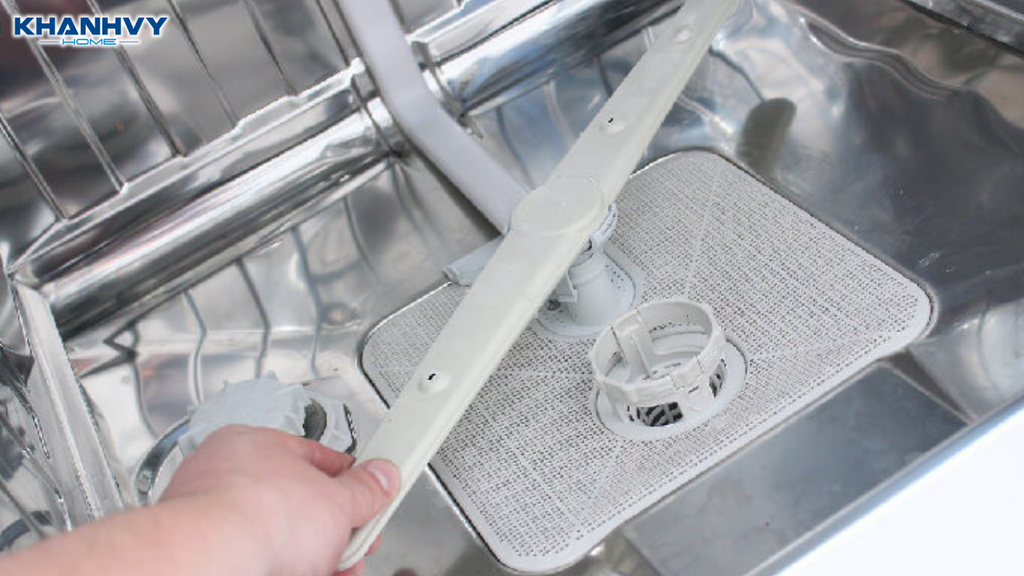 Nguyên nhân: Cặn thức ăn nhỏ và cặn vôi trong nước lâu ngày có thể làm tắc các lỗ phun. Khi áp lực nước giảm, tia nước không đủ mạnh để cuốn trôi vết bẩn, khiến bát đĩa rửa xong vẫn còn cặn.