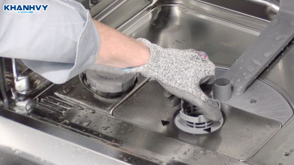 Bộ lọc nằm ở đáy khoang rửa và là nơi dễ tích tụ cặn thức ăn nhất. Tháo bộ lọc ra và rửa sạch dưới vòi nước, chú ý làm sạch cả lưới lọc và các khe nhỏ.