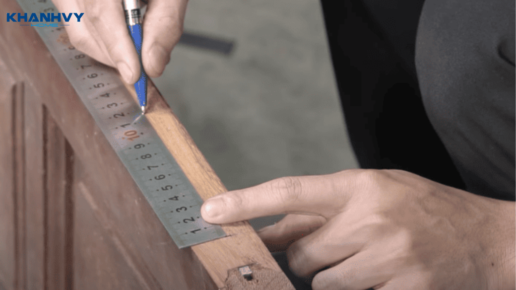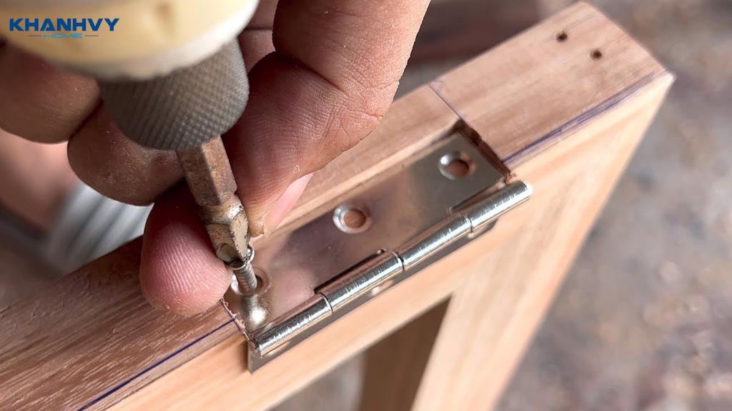 Sau khi xác định vị trí, người thợ dùng bút chì đánh dấu tâm lỗ vít rồi khoan bằng mũi khoan phù hợp. Mũi khoan phải đảm bảo khoan thẳng, đều, không quá sâu để tránh phá gỗ. Nếu thi công trên chất liệu gỗ dễ sứt như MDF phủ melamine, nên dán băng keo giấy quanh vùng khoan để giữ mép đẹp và hạn chế mẻ cạnh.