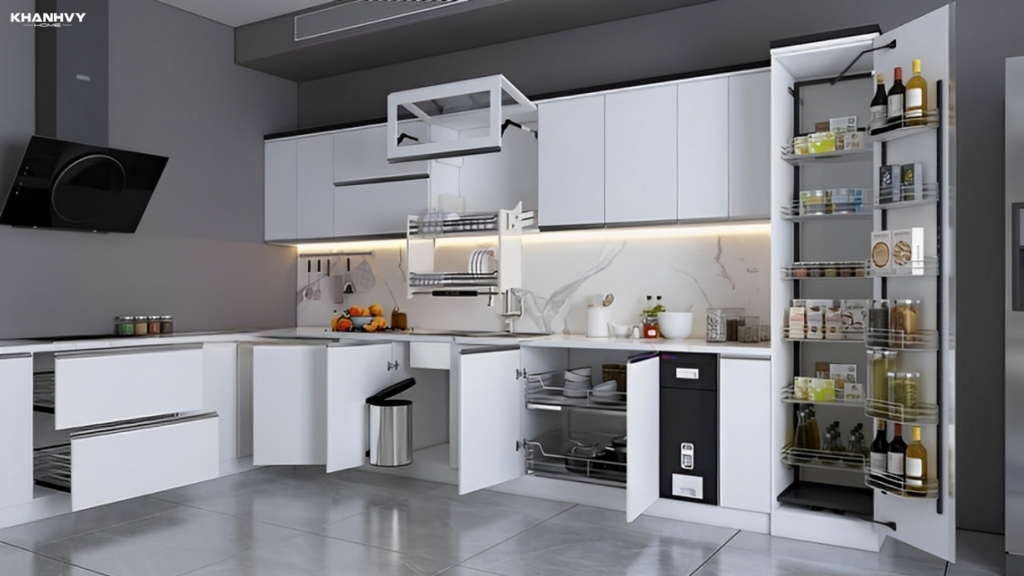 - Ưu tiên phụ kiện có ray trượt, bản lề giảm chấn, khay thoát nước (nếu cần) những chi tiết này giúp việc sử dụng thuận tiện hơn, kéo–đẩy nhẹ nhàng, đồ dễ lấy và bếp gọn gàng hơn.