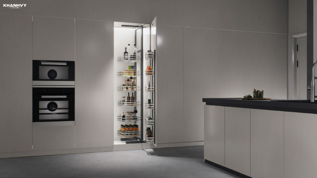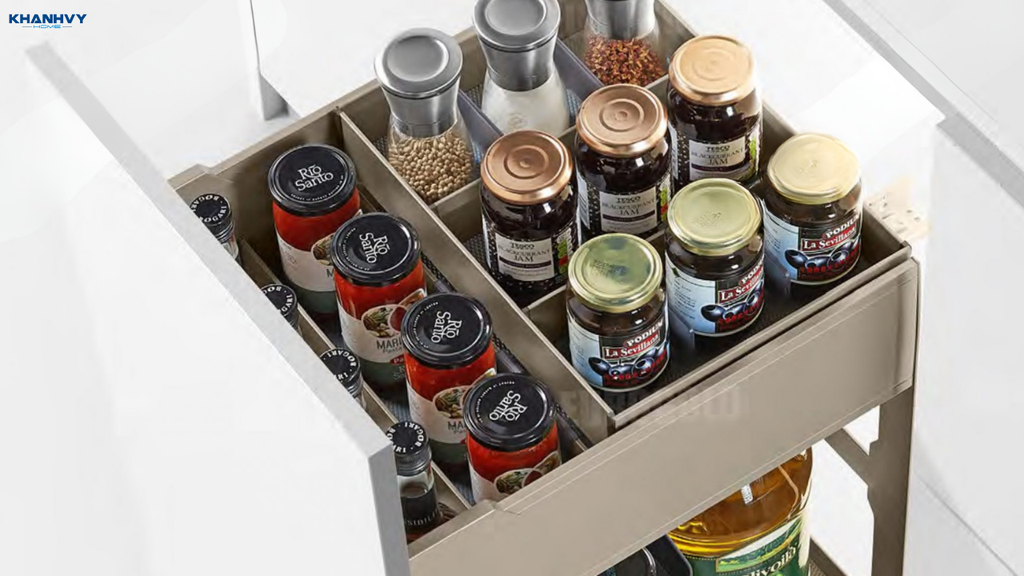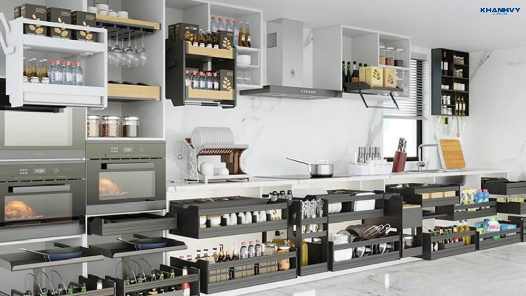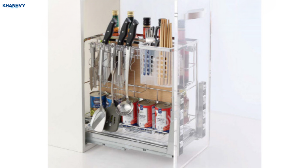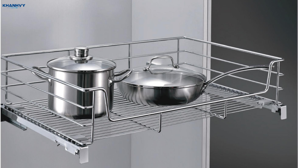Nhiều mẫu còn trang bị ray kéo êm ái, giúp lấy đồ nhanh chóng và an toàn. Với kiểu dáng gọn gàng, hiện đại, kệ không chỉ tối ưu công năng mà còn nâng cao vẻ sang trọng, gọn gàng cho không gian bếp.